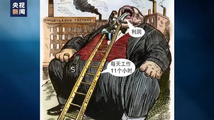 在這張漫畫中,一名瘦削的童工一天工作11個小時,將利潤送進(jìn)貪婪的雇主口中,將他們養(yǎng)得腦滿腸肥。