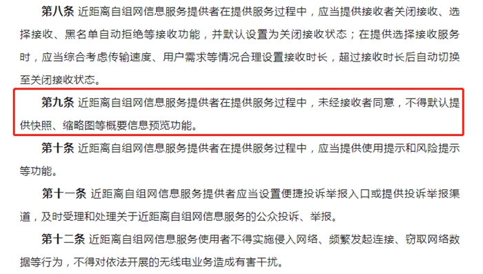 征求意見(jiàn)稿還提出,近距離自組網(wǎng)信息服務(wù)提供者在提供服務(wù)過(guò)程中,應(yīng)當(dāng)提供接收者關(guān)閉接收、選擇接收、黑名單自動(dòng)拒絕等接收功能,并默認(rèn)設(shè)置為關(guān)閉接收狀態(tài)。(完)