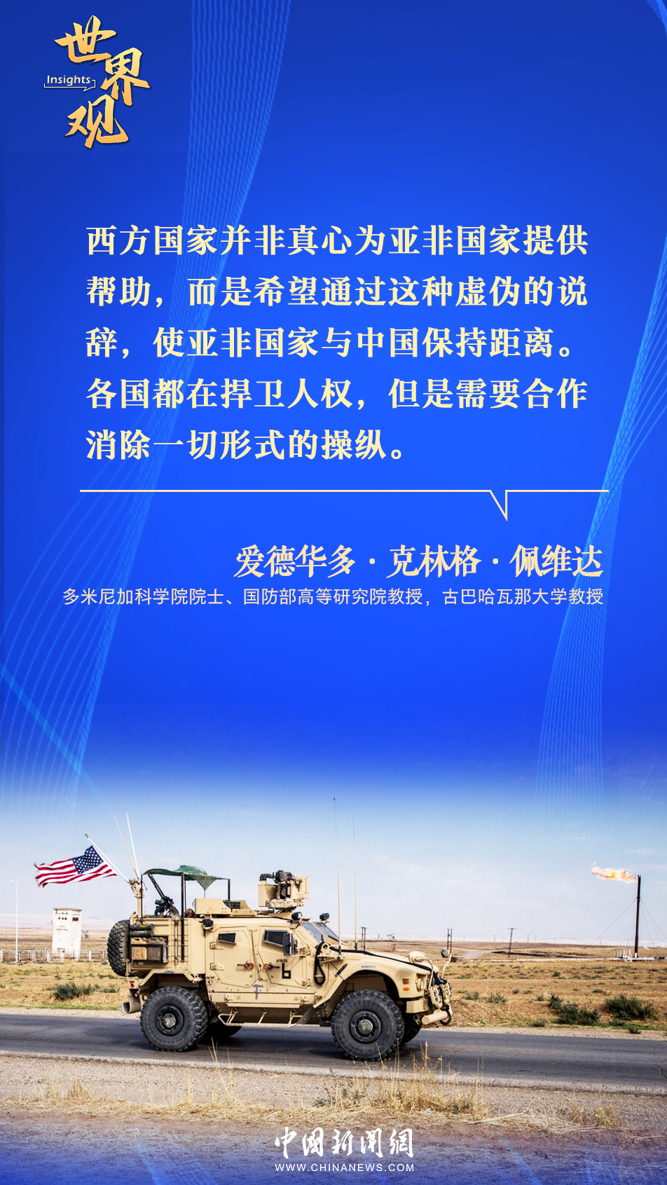 多米尼加科學(xué)院院士、國防部高等研究院教授、古巴哈瓦那大學(xué)教授愛德華多·克林格·佩維達(dá)表示,西方對(duì)亞非國家的幫助是虛偽的,其真實(shí)目的在于操縱亞非國家與中國保持距離。