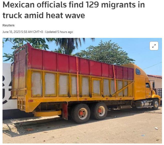 據(jù)報(bào)道,移民當(dāng)局表示,他們?cè)谝惠v卡車內(nèi)發(fā)現(xiàn)了這些移民,事發(fā)地近日正遭受熱浪侵襲,當(dāng)天的室外溫度已達(dá)到45攝氏度。