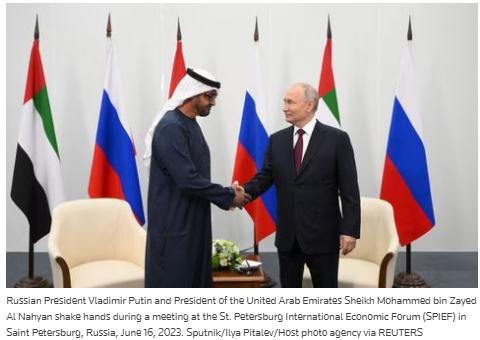 當(dāng)?shù)貢r(shí)間16日,阿聯(lián)酋總統(tǒng)穆罕默德·本·扎耶德·阿勒納哈揚(yáng)與俄羅斯總統(tǒng)普京在圣彼得堡國(guó)際經(jīng)濟(jì)論壇會(huì)晤。圖片來(lái)源:路透社報(bào)道截圖