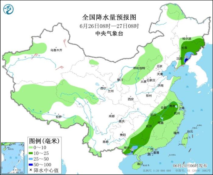 全國(guó)降水量預(yù)報(bào)圖(6月25日08時(shí)-26日08時(shí))