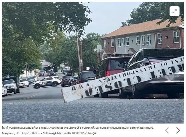 當(dāng)?shù)貢r(shí)間7月2日凌晨,美國馬里蘭州巴爾的摩的一場(chǎng)社區(qū)派對(duì)結(jié)束后,發(fā)生了大規(guī)模槍擊事件,造成2人死亡,28人受傷,其中包括14名未成年人。圖片來源:路透社報(bào)道截圖