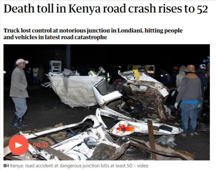 中新網(wǎng)7月2日電 綜合外媒報(bào)道,當(dāng)?shù)貢r(shí)間6月30日,肯尼亞西部發(fā)生近年來最嚴(yán)重車禍,一輛載有集裝箱的卡車“失控”,撞向多輛汽車和附近人群。截至7月1日,遇難人數(shù)已升至50余人。