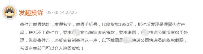 記者也注意到,在黑貓投訴平臺上就有消費者投訴稱,“寄件方是虛假地址、虛假名字、虛假手機號”,快遞平臺代收貨款1980元,拆件后發(fā)現(xiàn)是假冒偽劣產(chǎn)品,聯(lián)系不上寄件方,要求快遞公司凍結該筆貨款并退回,快遞公司沒有給予處理。