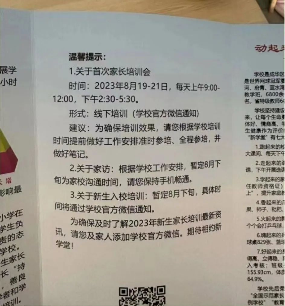 這則通知書是發(fā)給成都某小學(xué)2023級新生家長的,包含了寫給家長的一封信、學(xué)校簡介、學(xué)校的教育理想等內(nèi)容,其中,引發(fā)家長們熱議的,是在通知書的溫馨提示部分,家長們被告知:學(xué)校將在8月19日到21日舉行首次家長培訓(xùn)會,形式為線下,時間為三個全天。