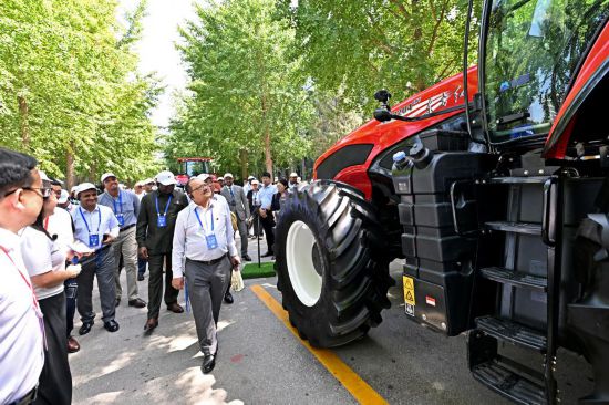 7月6日,駐華使節(jié)在國(guó)機(jī)集團(tuán)中國(guó)農(nóng)機(jī)院參觀“東方紅”拖拉機(jī)。新華社記者 李鑫 攝