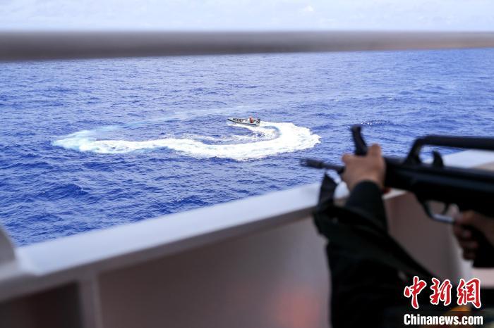 兩發(fā)紅色信號(hào)彈升空,一聲長(zhǎng)汽笛響徹海域。指揮所通過(guò)16國(guó)際頻道用英語(yǔ)向高速接近的“海盜艇”發(fā)出警告:“你迅速離開(kāi),否則后果自負(fù)?!彪S船取證人員全程照相、錄像取證。