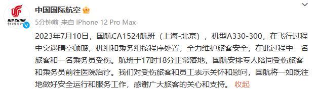 事后,據(jù)國航回應,在此過程中一名旅客和一名乘務員受傷。航班于17時18分正常落地,國航安排專人陪同受傷旅客和乘務員前往醫(yī)院治療。