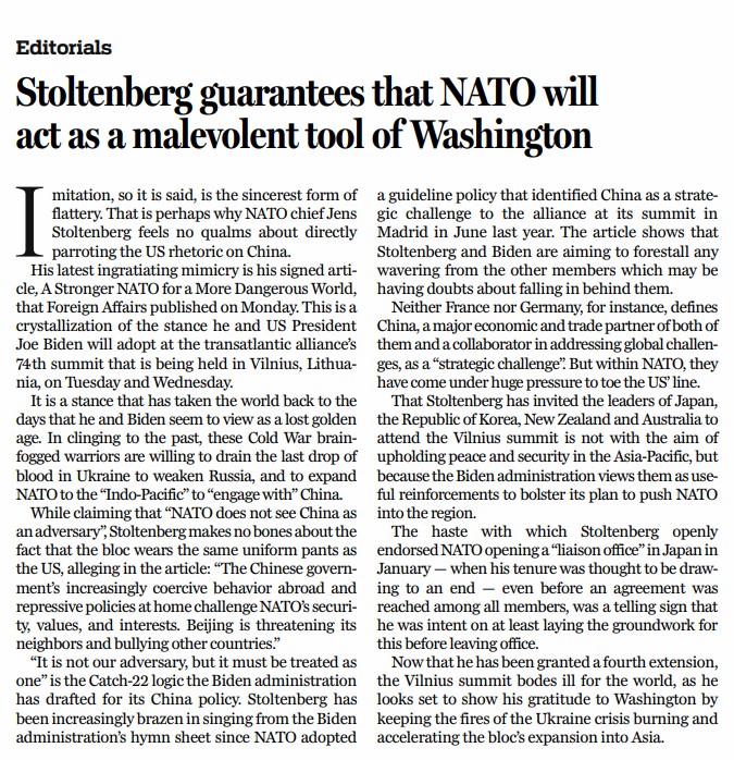 他最近的模仿是于7月10日在《外交事務》上發(fā)表題為《更強大的北約,應對更危險的世界》的署名文章,字里行間透露了他和美國總統(tǒng)拜登在北約峰會上的立場。為了固守過去,這些頭腦昏昏的冷戰(zhàn)“斗士”寧愿讓烏克蘭流盡最后一滴血,以削弱俄羅斯,并將北約擴大到所謂“印太”地區(qū),遏制中國。