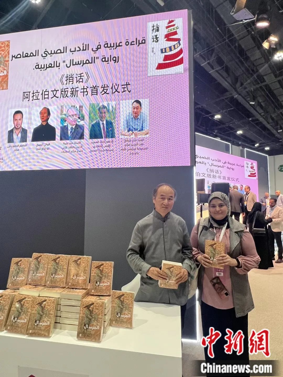 在阿布扎比國(guó)際書(shū)展上,譯林出版社與埃及??诉~特文化集團(tuán)聯(lián)合舉辦《捎話》阿拉伯文版新書(shū)首發(fā)儀式。譯林出版社 供圖