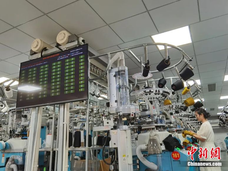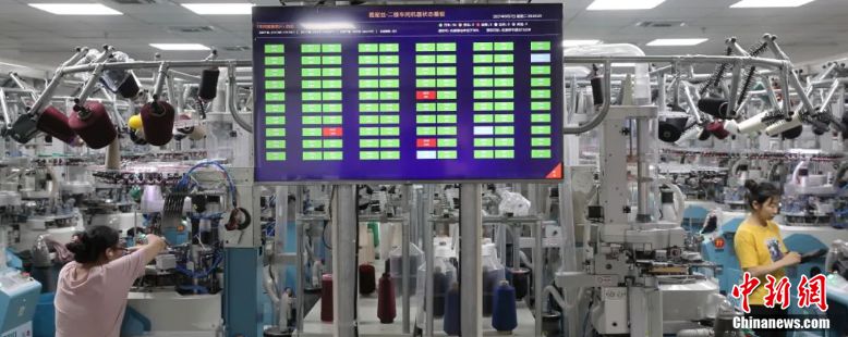 以縫頭為例,在一體化襪機之前,傳統(tǒng)的手工縫頭需要人工操作,效率很低,更新為襪機后,成本降低了至少一半。而智能系統(tǒng)端,機器的效率則被更加量化地體現(xiàn)在大屏幕上,一目了然,哪臺襪機出現(xiàn)問題,車間數(shù)據(jù)顯示屏就能看到,避免生產(chǎn)出次品襪子造成浪費。