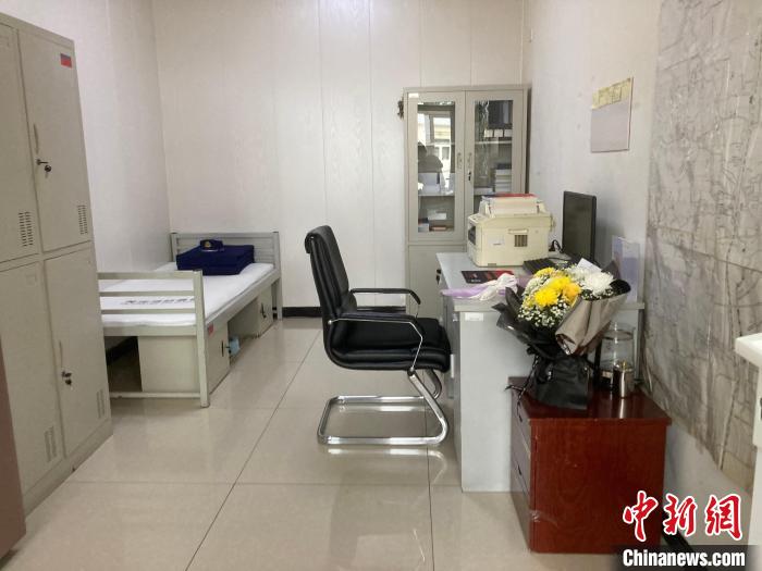 2023年8月,馮振在西小營(yíng)小型站工作和生活的站長(zhǎng)室,墻上貼著馮振和隊(duì)員一起繪制的地圖?!≈行律缬浾?徐婧 攝