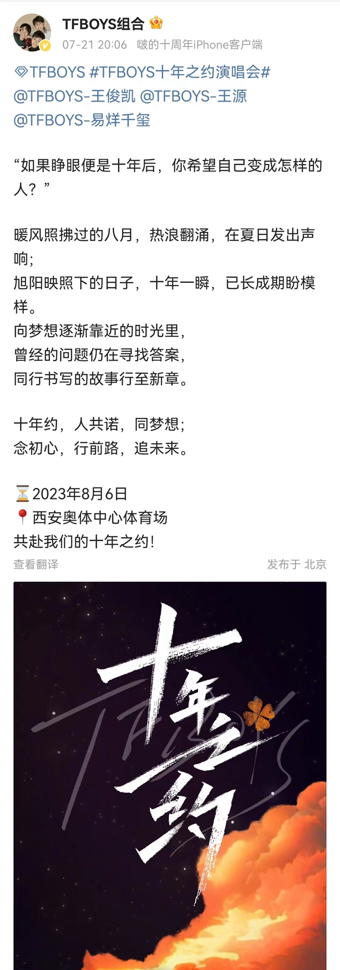 TFBOYS十年之約演唱會倡議。來源:TFBOYS官微。