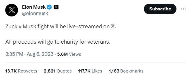 當(dāng)?shù)貢r(shí)間6日,馬斯克在“X”平臺(tái)上發(fā)文稱(chēng),要將兩人約架過(guò)程在“X”平臺(tái)直播,并把相關(guān)收益全部捐贈(zèng)給服務(wù)退伍老兵的慈善機(jī)構(gòu),同時(shí)表示自己正在為決斗“夜以繼日”地訓(xùn)練。