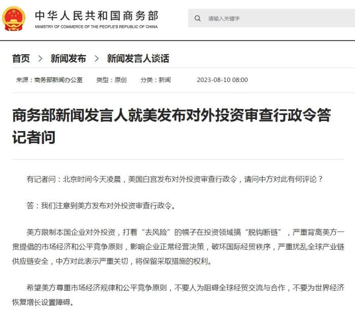 中國商務(wù)部新聞發(fā)言人8月10回應(yīng)稱,美方限制本國企業(yè)對外投資,打著“去風險”的幌子在投資領(lǐng)域搞“脫鉤斷鏈”,嚴重背離美方一貫提倡的市場經(jīng)濟和公平競爭原則,影響企業(yè)正常經(jīng)營決策,破壞國際經(jīng)貿(mào)秩序,嚴重擾亂全球產(chǎn)業(yè)鏈供應(yīng)鏈安全,中方對此表示嚴重關(guān)切,將保留采取措施的權(quán)利。