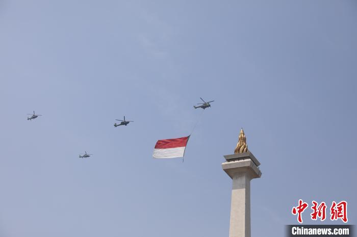 8月17日,雅加達獨立廣場上空,直升機拉起巨幅印尼國旗。中新社記者 李志全 攝