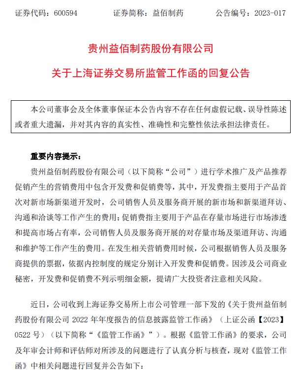 益佰制藥回復(fù)上交所年報監(jiān)管函。