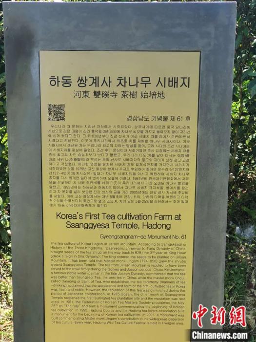 田杰:茶是什么時候、如何傳入韓國的,說法比較多。不過普遍認(rèn)為韓國茶文化是始于朝鮮半島的三國時期。有“新羅善德女王時期萌芽,興德王時期盛行”的說法。據(jù)記載,新羅興德王3年,也就是公元828年,興德王派使臣“大廉”出使中國。回國的時候大廉帶回了茶種,新羅王將茶種種在了智異山腳下。之后雙溪寺的僧人將其在寺院周圍培植,形成了大片茶園?,F(xiàn)在全羅道河?xùn)|是韓國綠茶的主要產(chǎn)地之一。在河?xùn)|雙溪寺附近有韓國茶“始培地”,并有碑刻。