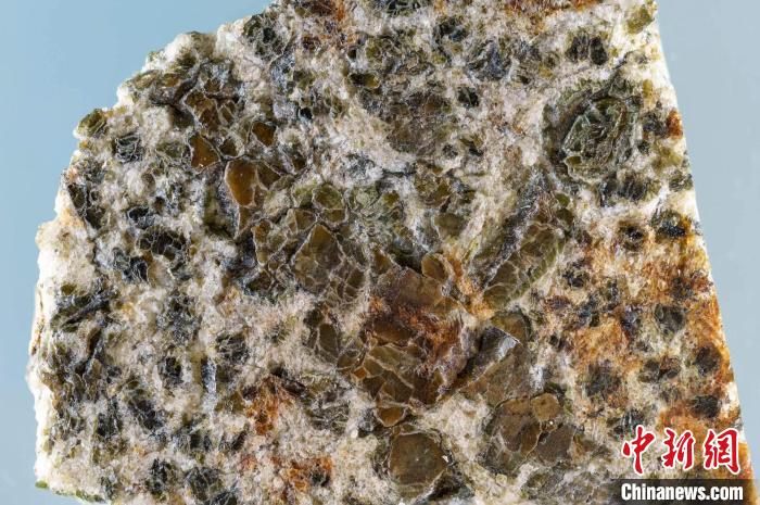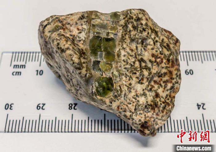 Erg Chech 002隕石樣本。該樣本約20毫米長(zhǎng),由斜長(zhǎng)石(白色)和兩種輝石(深綠色和棕色)組成的基質(zhì)中鑲嵌著一塊大的輝石晶體(圖片來自Yuri Amelin)。施普林格·自然 供圖