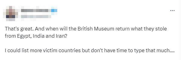 不少網(wǎng)友也在社交媒體上發(fā)文,要求大英博物館采取行動(dòng)。有人表示,“大英博物館什么時(shí)候能歸還他們從埃及、印度和伊朗偷來的東西?我可以列出更多受害國家……”