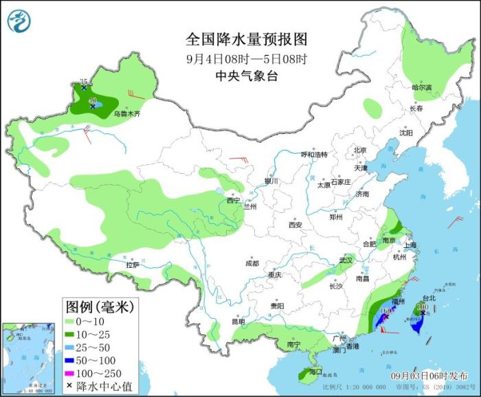 9月4日08時至5日08時,新疆沿天山地區(qū)和伊犁河谷、福建東南部、廣東東部、海南島西北部、臺灣島等地部分地區(qū)有中到大雨,其中,福建東南部沿海地區(qū)、廣東東南部沿海、臺灣島東部等地部分地區(qū)有暴雨或大暴雨(100~160毫米)。內(nèi)蒙古西北部、新疆南疆盆地、福建東部沿海等地部分地區(qū)有5~7級風(fēng)。東海南部、臺灣以東洋面、臺灣海峽、巴士海峽、南海東北部有6~8級大風(fēng)、陣風(fēng)10~11級,其中臺灣以東洋面、臺灣海峽、巴士海峽北部、南海東北部部分海域風(fēng)力可達(dá)9~11級、陣風(fēng)13~14級。