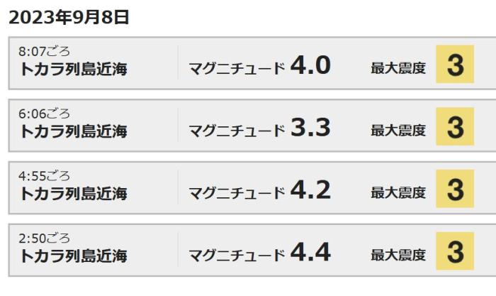 據(jù)報(bào)道,4次地震的震級分別為4.4級、4.2級、3.3級和4.0級,震中都位于鹿兒島縣吐噶喇列島附近,附近的土島村有明顯震感。