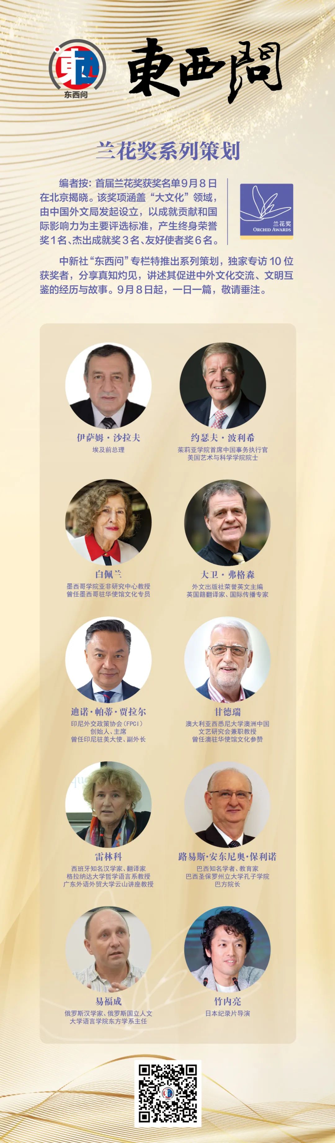 中新社“東西問”專欄特推出系列策劃,獨(dú)家專訪10位獲獎?wù)?,分享真知灼見,講述其促進(jìn)中外文化交流、文明互鑒的經(jīng)歷與故事。9月8日起,一日一篇,敬請垂注。