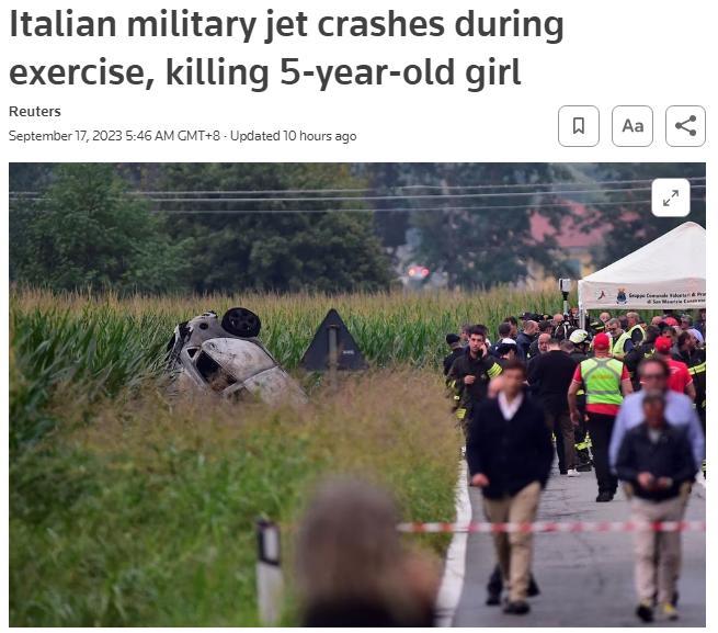 中新網(wǎng)9月17日電 綜合外媒報(bào)道,當(dāng)?shù)貢r(shí)間16日,意大利空軍“三色箭”飛行表演隊(duì)的一架飛機(jī)在都靈郊外訓(xùn)練時(shí)墜毀,導(dǎo)致地面一名5歲女童身亡,飛行員在墜毀前彈射逃生。