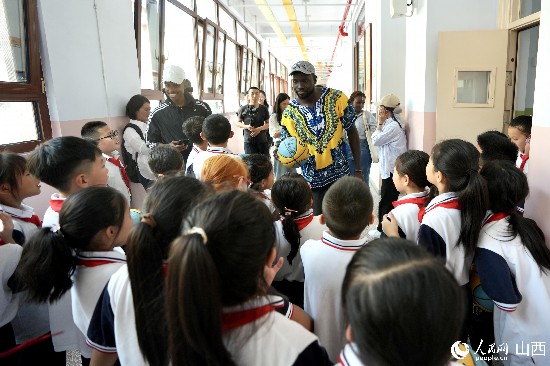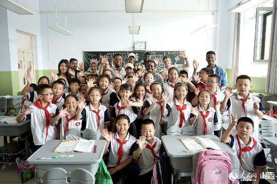 圖為選手和午亭小學的學生合影留念。人民網(wǎng) 盧鵬宇攝