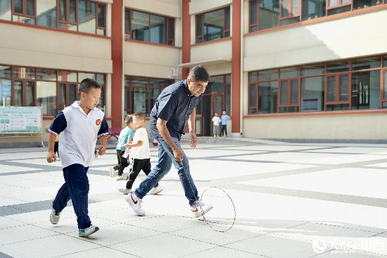 圖為沙杰和午亭小學的學生一起玩滾鐵圈。人民網(wǎng) 盧鵬宇攝