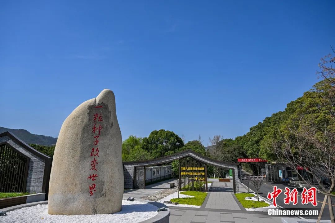 一顆標有“一粒種子 改變世界”紅色大字的稻米石頭高高聳立在安江農校紀念園門口。潘雨 攝