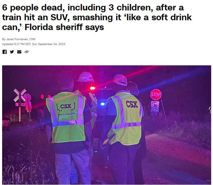 中新網(wǎng)9月25日電 據(jù)美國(guó)有線電視新聞網(wǎng)(CNN)24日?qǐng)?bào)道,當(dāng)?shù)貢r(shí)間23日晚,美國(guó)佛羅里達(dá)州希爾斯伯勒縣一列火車在經(jīng)過(guò)鐵路口時(shí)與一輛SUV汽車相撞,造成6人遇難,其中包括3名兒童。