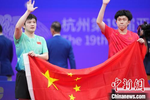 10月2日,杭州第19屆亞運會乒乓球男子單打決賽在拱墅運河體育公園體育館舉行,中國選手王楚欽4比3戰(zhàn)勝隊友樊振東,獲得冠軍。圖為王楚欽(右)與樊振東在賽后手持國旗向觀眾致意?!≈行律缬浾?田博川 攝