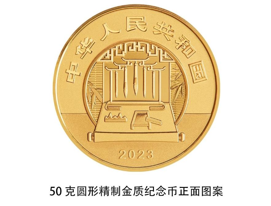 4枚圓形金銀紀念幣正面圖案均為筆、墨、紙、硯造型,輔以竹葉、窗等裝飾組合設(shè)計,并刊國名、年號。