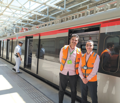8月6日,在埃及齋月十日城輕軌鐵路阿德利·曼蘇爾車站,兩名鐵路工作人員合影留念。