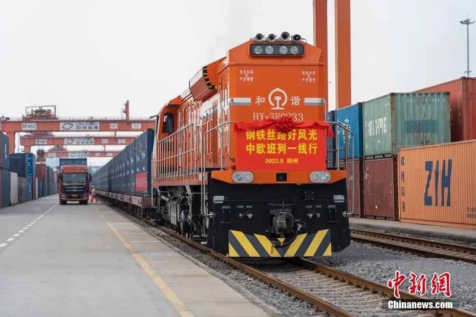 2023年9月17日,河南鄭州,一列滿載醫(yī)療器械、汽車配件等貨物的中歐班列(鄭州)從中國鐵路鄭州局集團有限公司圃田車站駛出,將經(jīng)中國二連浩特開往德國漢堡。