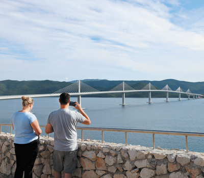 沿著克羅地亞狹長的海岸線一路向南行駛到科馬爾納地區(qū),遠(yuǎn)遠(yuǎn)就能望見如銀鏈般橫臥在山海之間的佩列沙茨大橋。在橋頭一側(cè)的休息區(qū),人們紛紛停下車來,對著大橋拍照留念。來自克羅地亞北部的卡塞爾和朋友們特地自駕來到這里,開心地請本報(bào)記者幫忙合影。“佩列沙茨大橋連通了克羅地亞南北領(lǐng)土,是我們心中最美的大橋!”卡塞爾說。