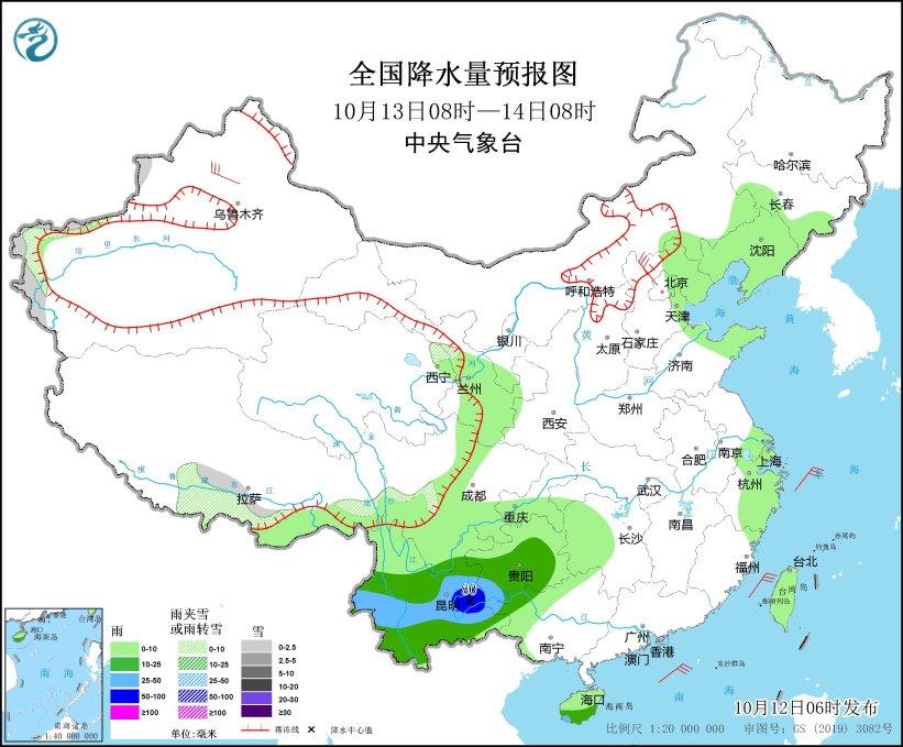 10月13日08時(shí)至14日08時(shí),新疆西部、西藏南部等地部分地區(qū)有小雪或雨夾雪;四川南部、貴州中南部、云南大部等地部分地區(qū)有中到大雨,其中,云南東部局地有暴雨(50~80毫米)。新疆西北部、河北北部等地部分地區(qū)有5~6級(jí)風(fēng);臺(tái)灣海峽、巴士海峽、南海北部海域、北部灣等海域有5~7級(jí)風(fēng)、陣風(fēng)8級(jí)。(見(jiàn)圖2)。