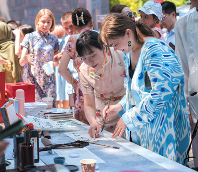 5月,“茶和天下·雅集”活動在烏茲別克斯坦首都塔什干舉行,當?shù)厥忻裨诨顒蝇F(xiàn)場通過書法、剪紙和工藝品展示等領略豐富多彩的中國文化。