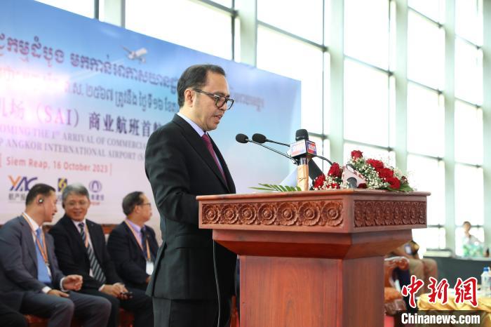 10月16日,柬埔寨暹粒吳哥國際機場通航運營。圖為柬埔寨副首相兼內(nèi)閣辦公廳大臣翁賽維索在首航儀式上致辭 (黎海月 攝)