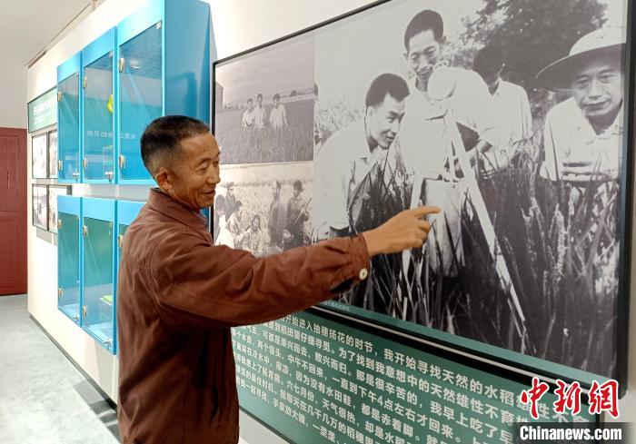 10月13日,在安江農(nóng)校紀(jì)念園內(nèi)的雜交水稻發(fā)源地紀(jì)念館,袁隆平的學(xué)生宋澤觀講述袁隆平及其團隊研究雜交水稻的故事。中新社記者 鄧霞 攝