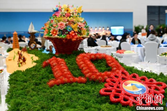 論壇新聞中心大門兩側擺放著兩塊主題燈光展板,走近細看,航行在大海中的帆船、在沙漠中行走的駱駝、“一帶一路”共建國家標志性建筑物等多個具有象征意義的圖案細節(jié)盡在其中。在餐廳中央取餐臺上,代表著共建“一帶一路”倡議10周年的數字“10”,和祈年殿等中國古建筑物代表性元素也都精妙地融于一體。
