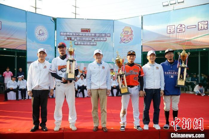 “昆山媽祖杯”海峽兩岸慢速壘球邀請賽已成為昆山的代表性體育賽事。圖為2021年10月24日,嘉賓在閉幕式上為獲得競技組前三名的球隊(duì)頒獎并合影。中新社記者 王駿 攝