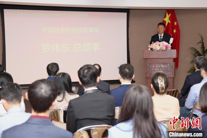 中國(guó)駐多倫多總領(lǐng)館10月21日為領(lǐng)區(qū)2022年度“國(guó)家優(yōu)秀自費(fèi)留學(xué)生獎(jiǎng)學(xué)金”獲得者頒獎(jiǎng)。圖為中國(guó)駐多倫多總領(lǐng)事羅偉東在儀式上致辭。中新社記者 余瑞冬 攝