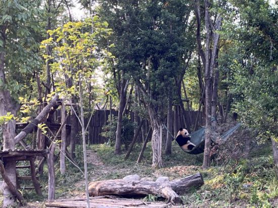 圖說:10月21日,四川成都大熊貓繁育研究基地,一只大熊貓?jiān)谟崎e進(jìn)食。