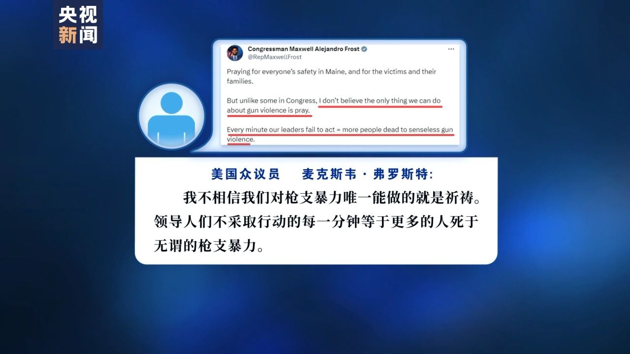 此外,每次槍擊案發(fā)生后,美國擁槍派政客都重復(fù)著空洞的安慰,這次也不例外。在多位擁槍派政客的社交媒體上,各種口頭安慰和無力的陳詞濫調(diào)比比皆是。對此,美國眾議員麥克斯韋·弗羅斯特(Maxwell Alejandro Frost)發(fā)推文寫道,“我不相信我們對槍支暴力唯一能做的就是祈禱。領(lǐng)導(dǎo)人們不采取行動的每一分鐘等于更多的人死于無謂的槍支暴力。”