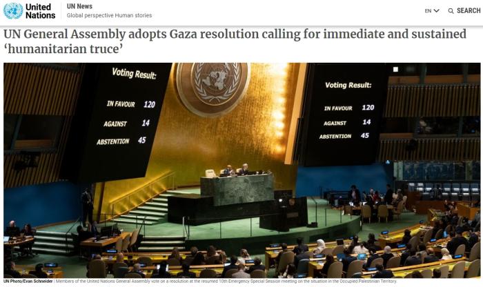 據(jù)聯(lián)合國網(wǎng)站消息,紐約當?shù)貢r間27日下午,第78屆聯(lián)大以125票贊成、14票反對和45票棄權的表決結(jié)果,通過了由約旦代表阿拉伯國家集團提交的一份聯(lián)大決議草案。