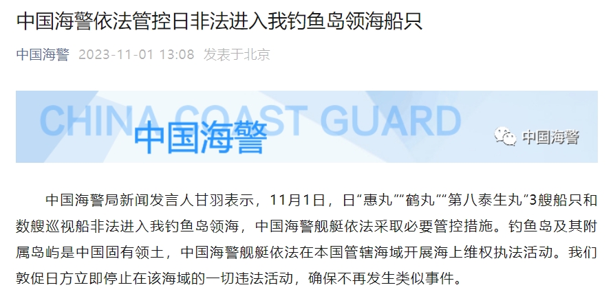 中新網(wǎng)11月1日電 據(jù)中國海警微博消息,中國海警局新聞發(fā)言人甘羽表示,11月1日,日“惠丸”“鶴丸”“第八泰生丸”3艘船只和數(shù)艘巡視船非法進(jìn)入我釣魚島領(lǐng)海,中國海警艦艇依法采取必要管控措施。釣魚島及其附屬島嶼是中國固有領(lǐng)土,中國海警艦艇依法在本國管轄海域開展海上維權(quán)執(zhí)法活動。我們敦促日方立即停止在該海域的一切違法活動,確保不再發(fā)生類似事件。