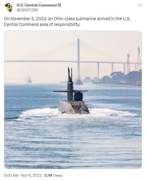 據(jù)報道,當(dāng)天,美國中央司令部在社交媒體上發(fā)帖稱,“11月5日,一艘‘俄亥俄’級戰(zhàn)略潛艇抵達中東地區(qū)?!?/p>